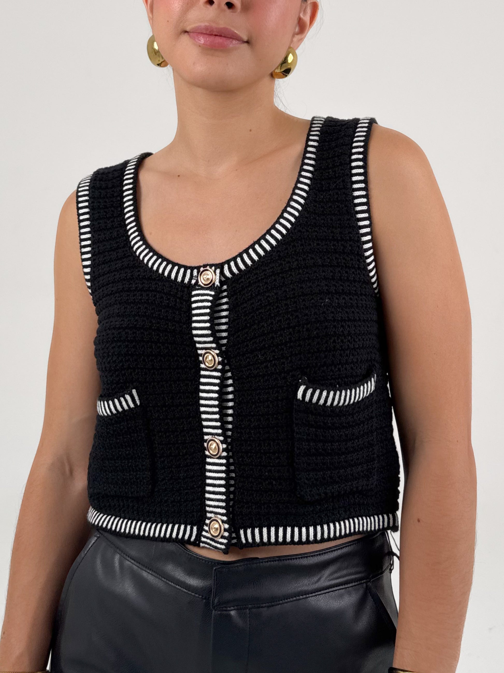 Chaleco de tejido tipo tweed con botones metálicos y detalles en blanco .