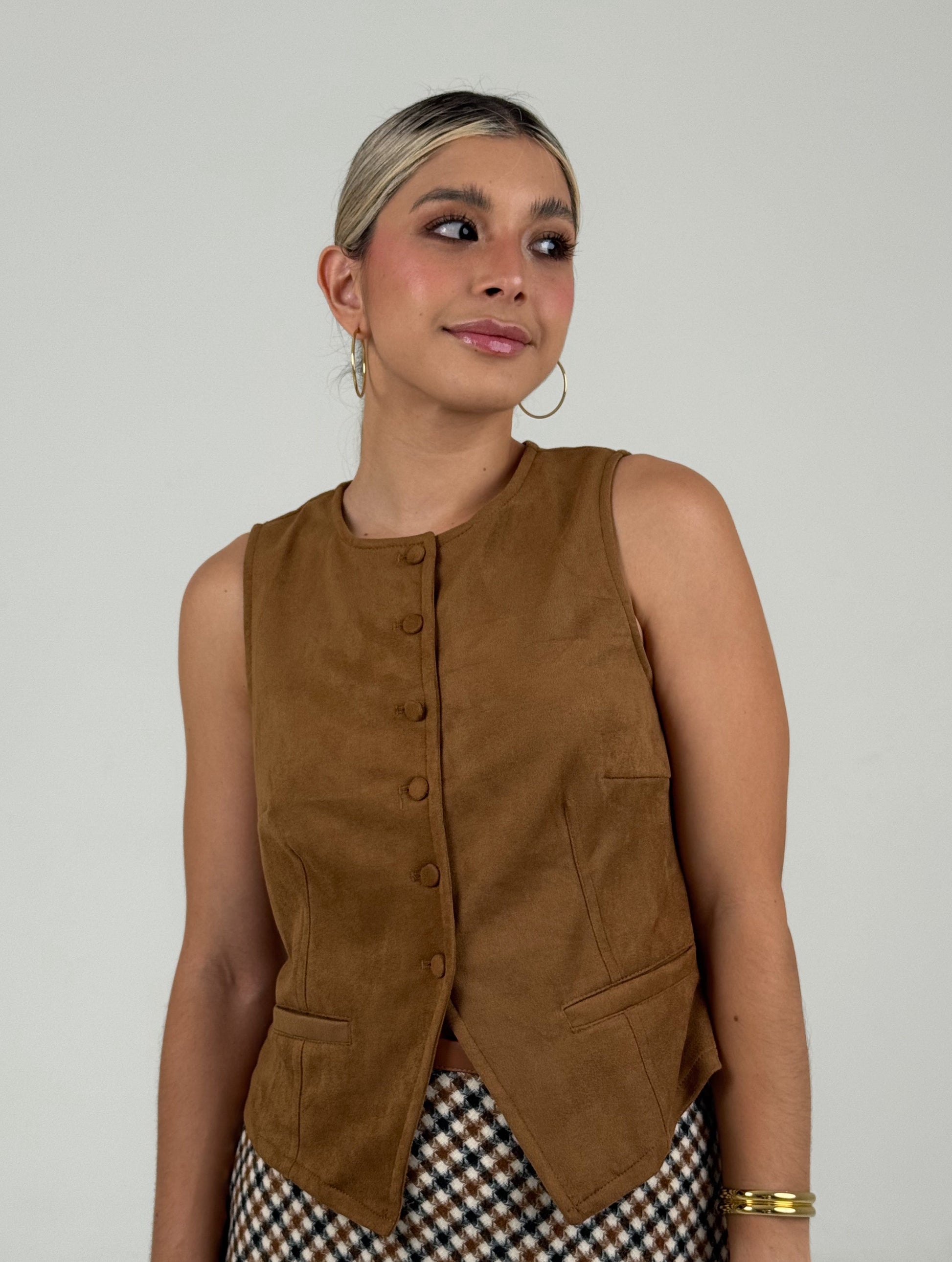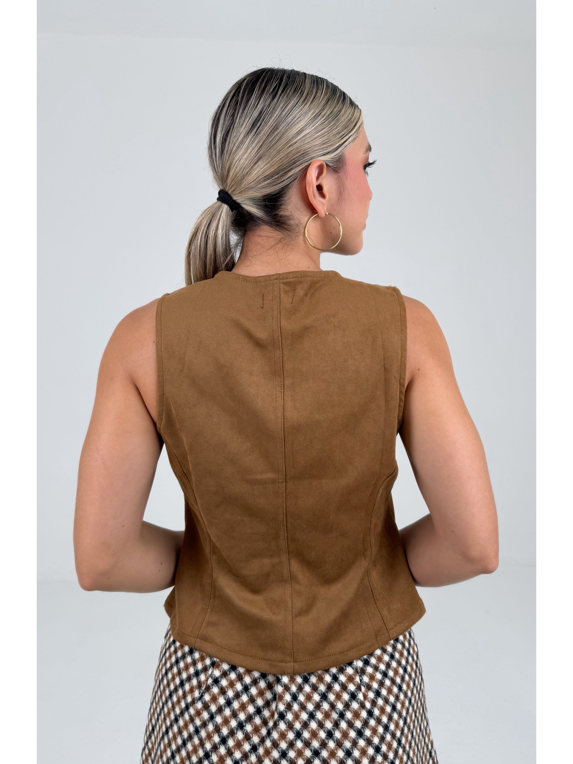 Chaleco de gamuza suave con botones forrados al frente. Textura ajustable y cómoda.