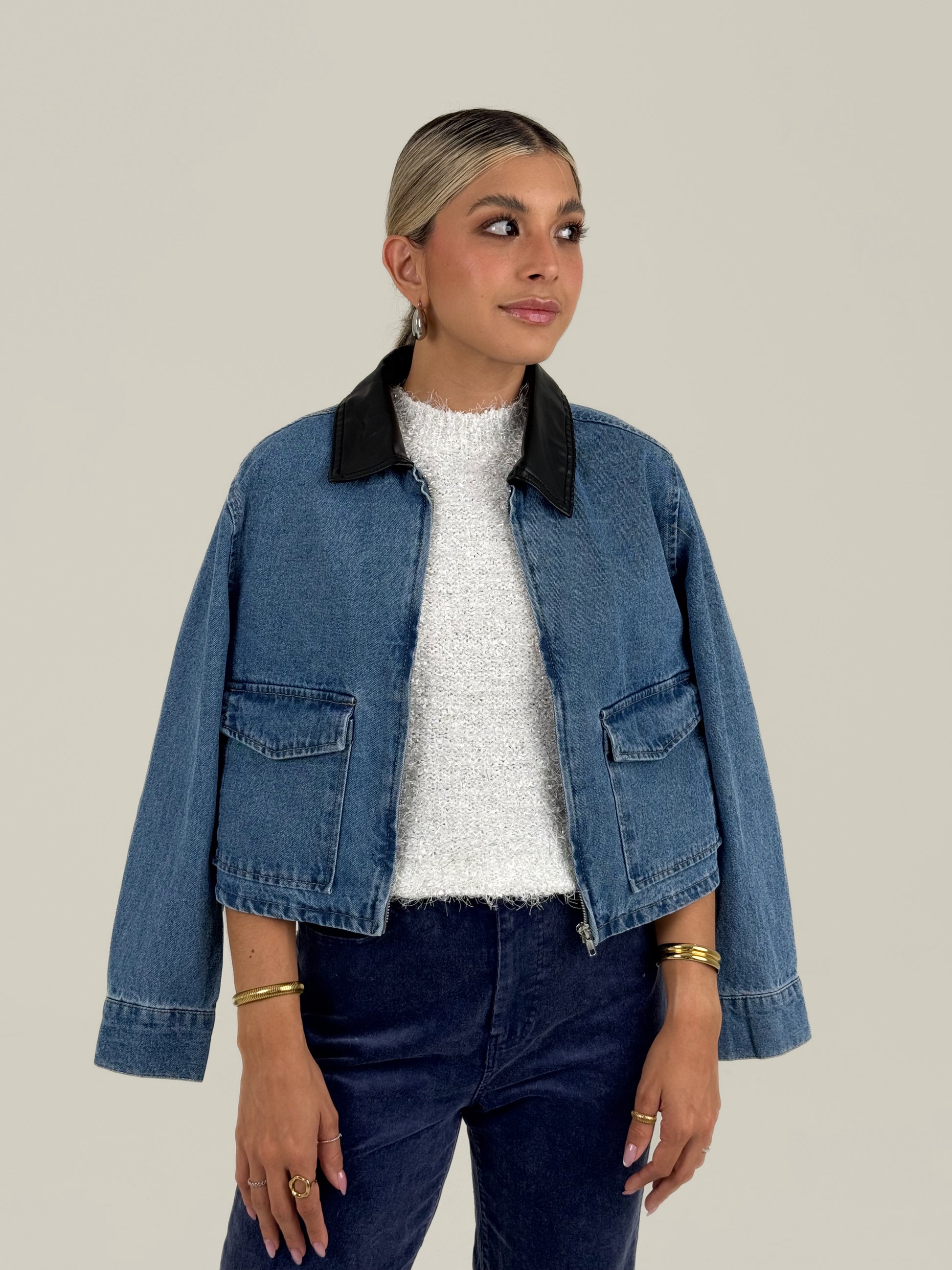 Chamarra de mezclilla suave con aplicación de piel sintética en cuello. Cierra metálico al frente.