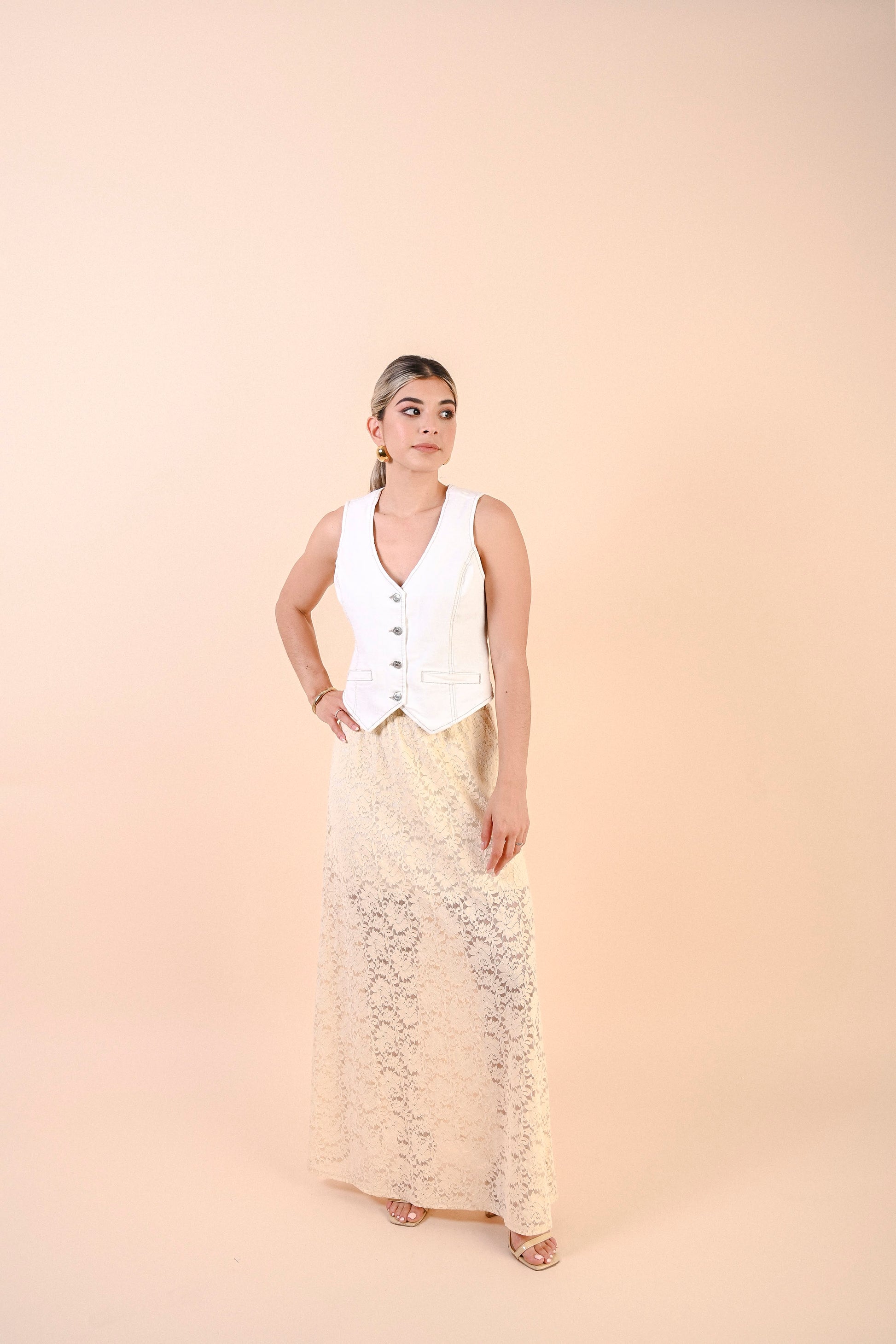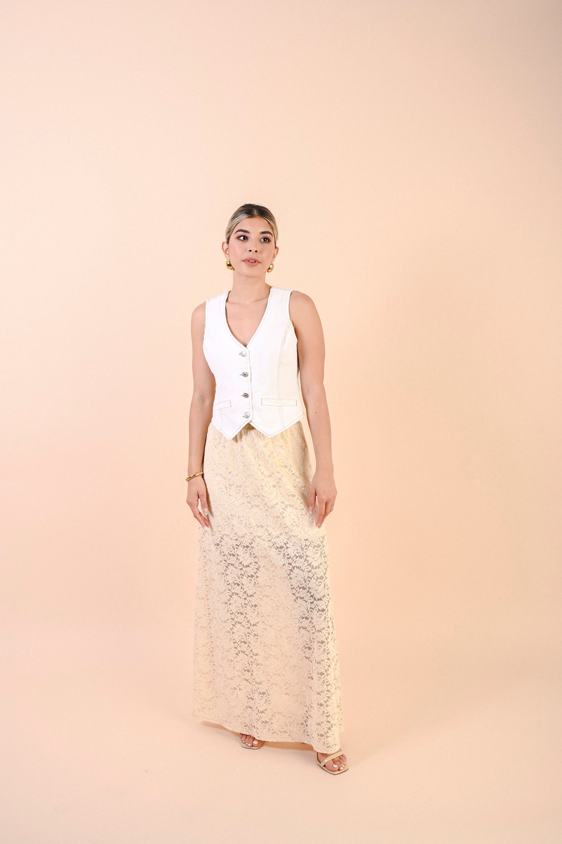¡Haz una declaración de estilo con nuestra hermosa falda de encaje beige! Con su elegante diseño de encaje, esta falda es la combinación perfecta de sofisticación y feminidad.