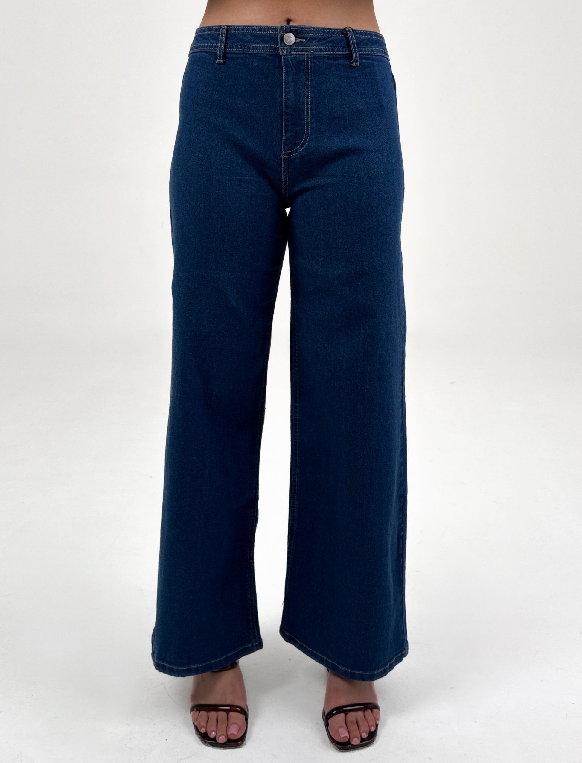 Pantalón de mezclilla súper stretch con bolsillos atrás. Corte wide leg.