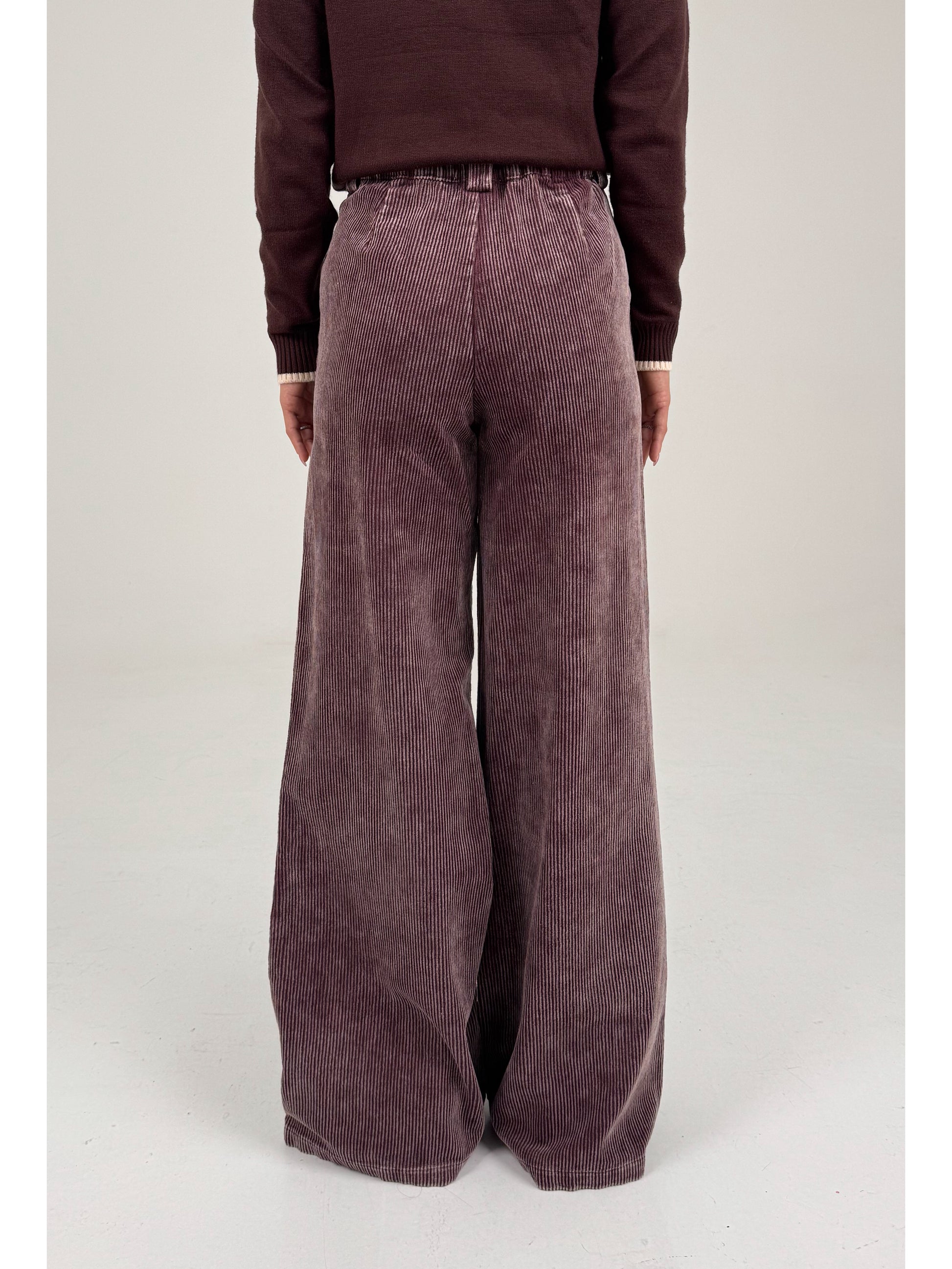 Pantalón de pana color tinto, efecto desgastado. Textura con caída y movimiento. Resorte ajustable en la pretina.