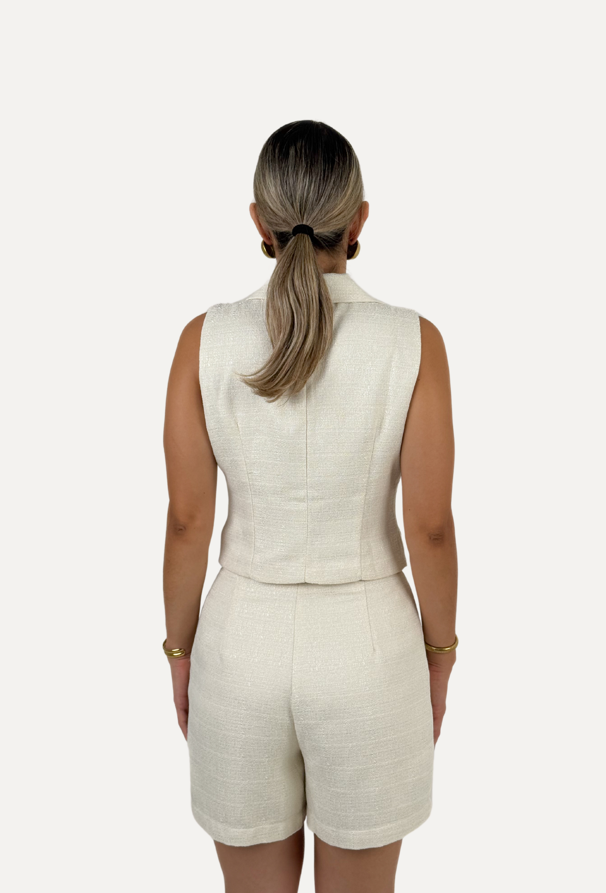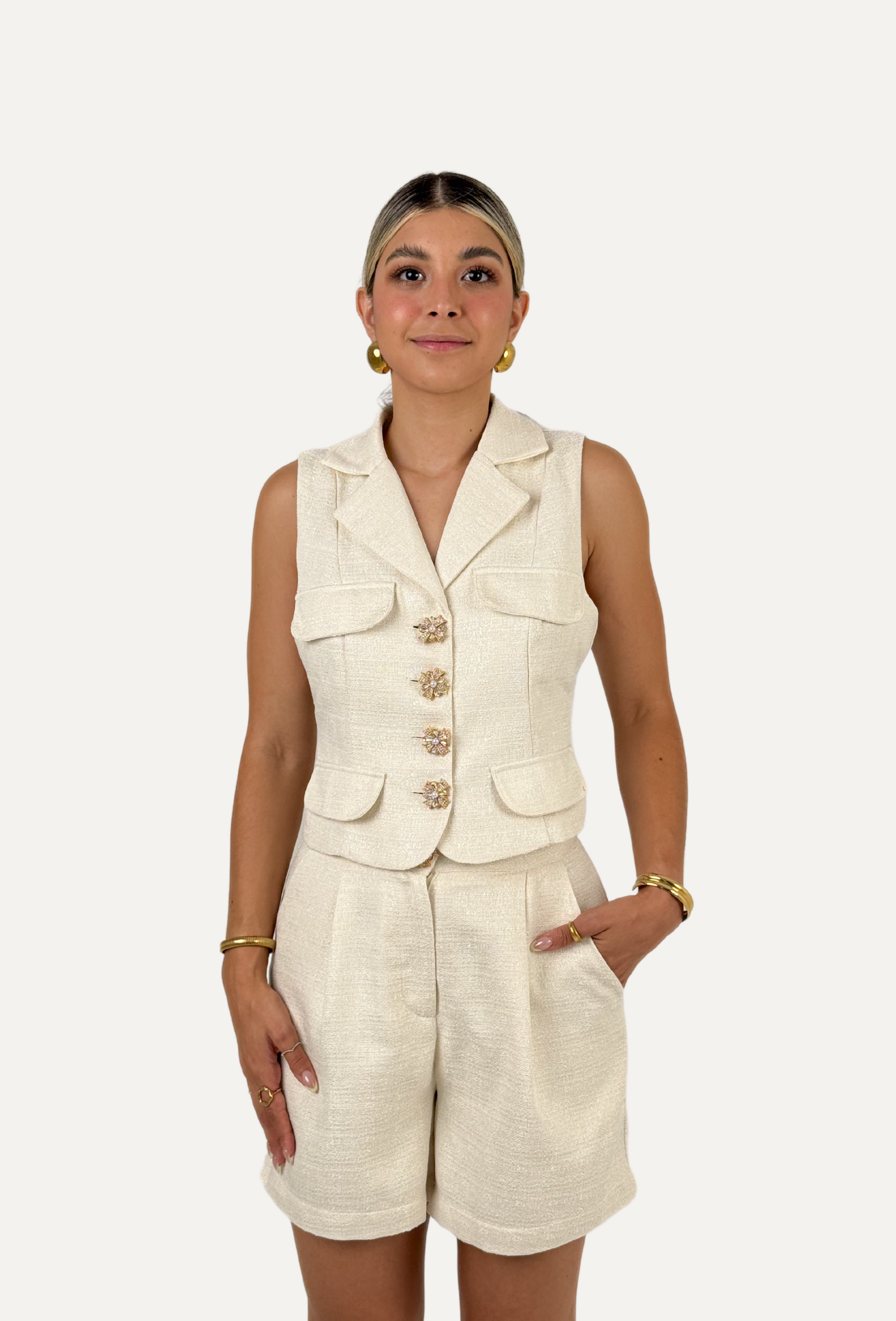 Set de chaleco y short en textura de vestir. Botones dorados con formas florales. Perfecto para un evento formal en el día.