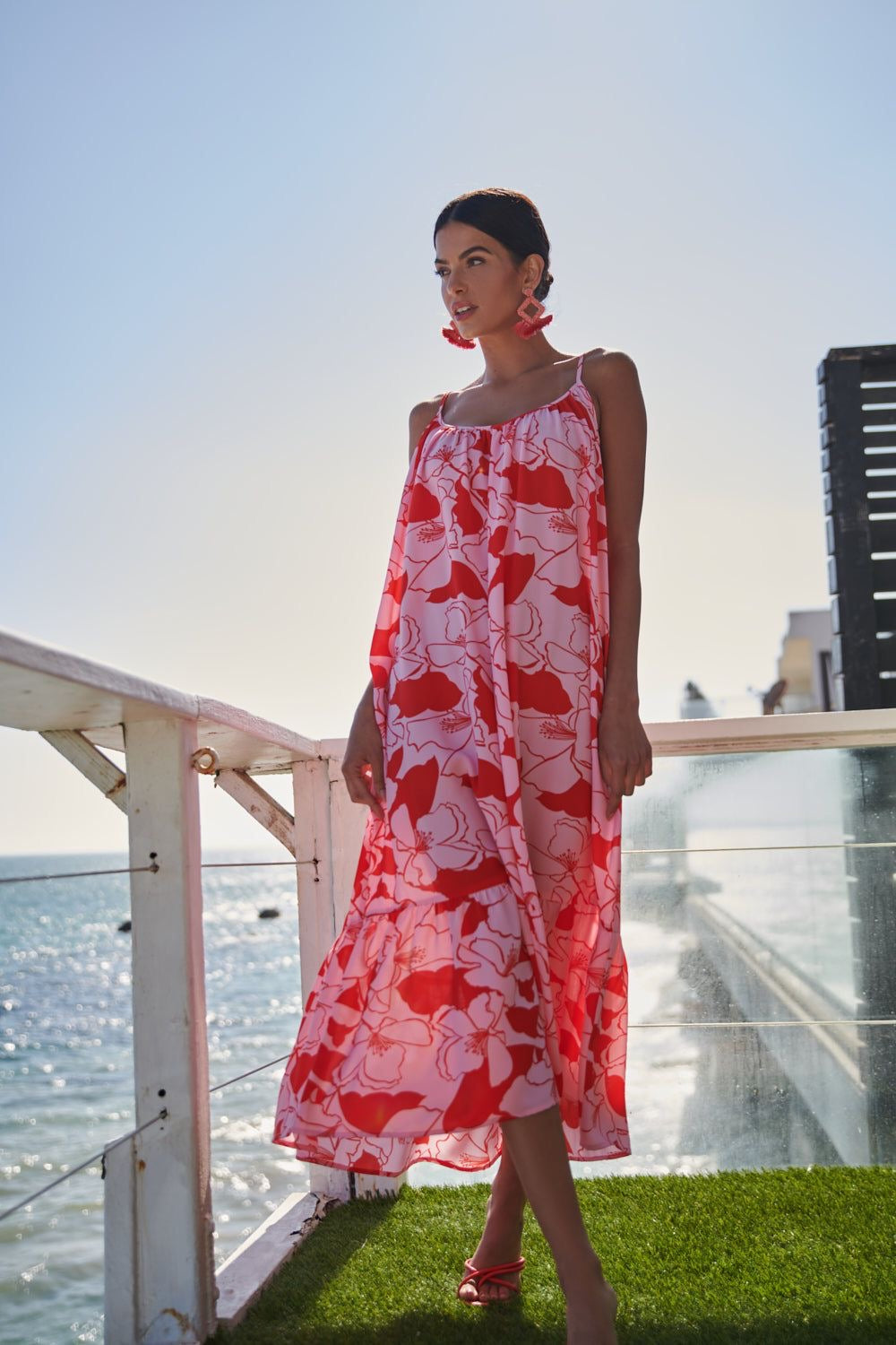 Vestido de shiffon con estampado florar en rosa y rojo. Tiene un lazo ajustable y desmontable.