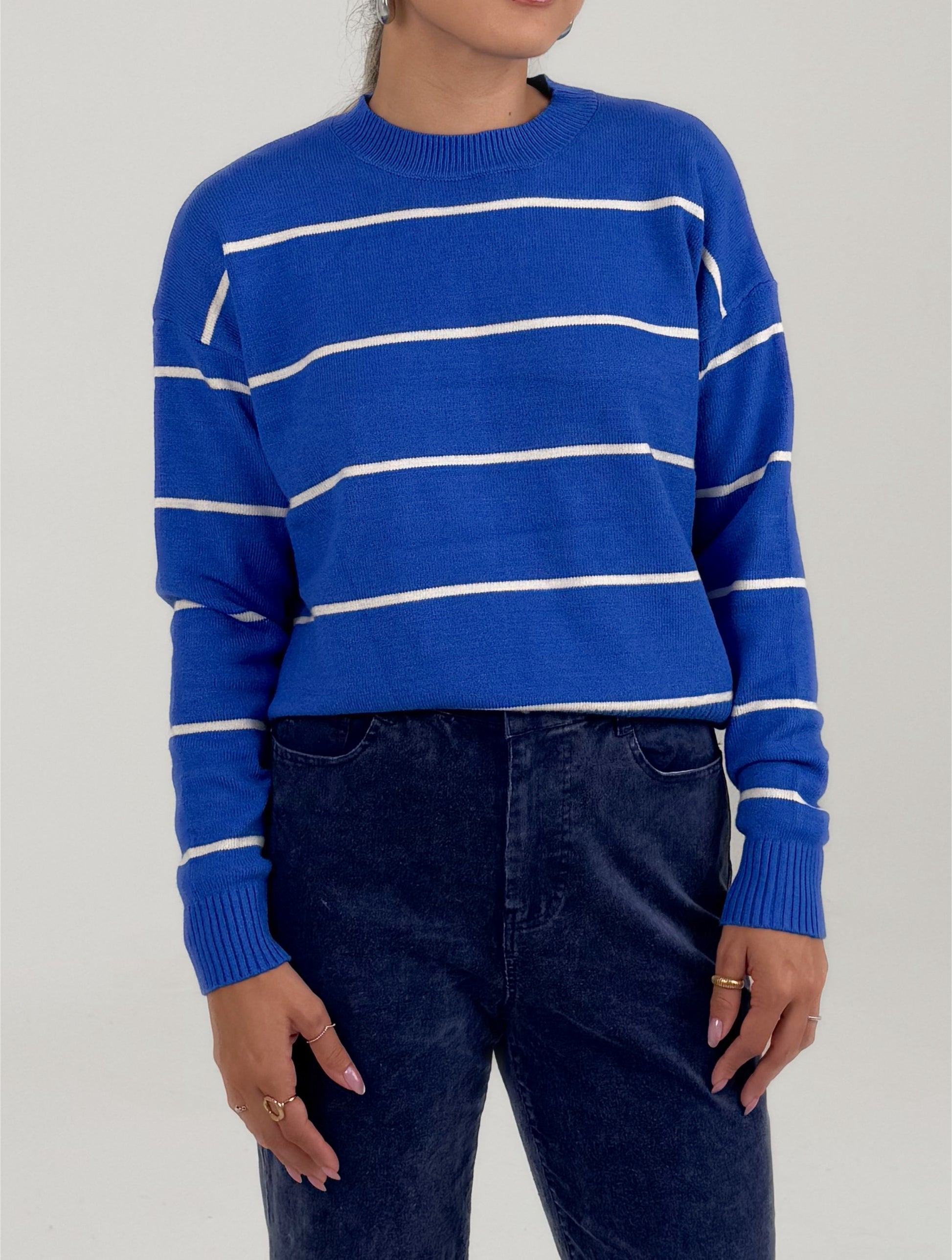 Suéter ligero con estampado de rayas color blanco. Cuello redondo, pieza básica.